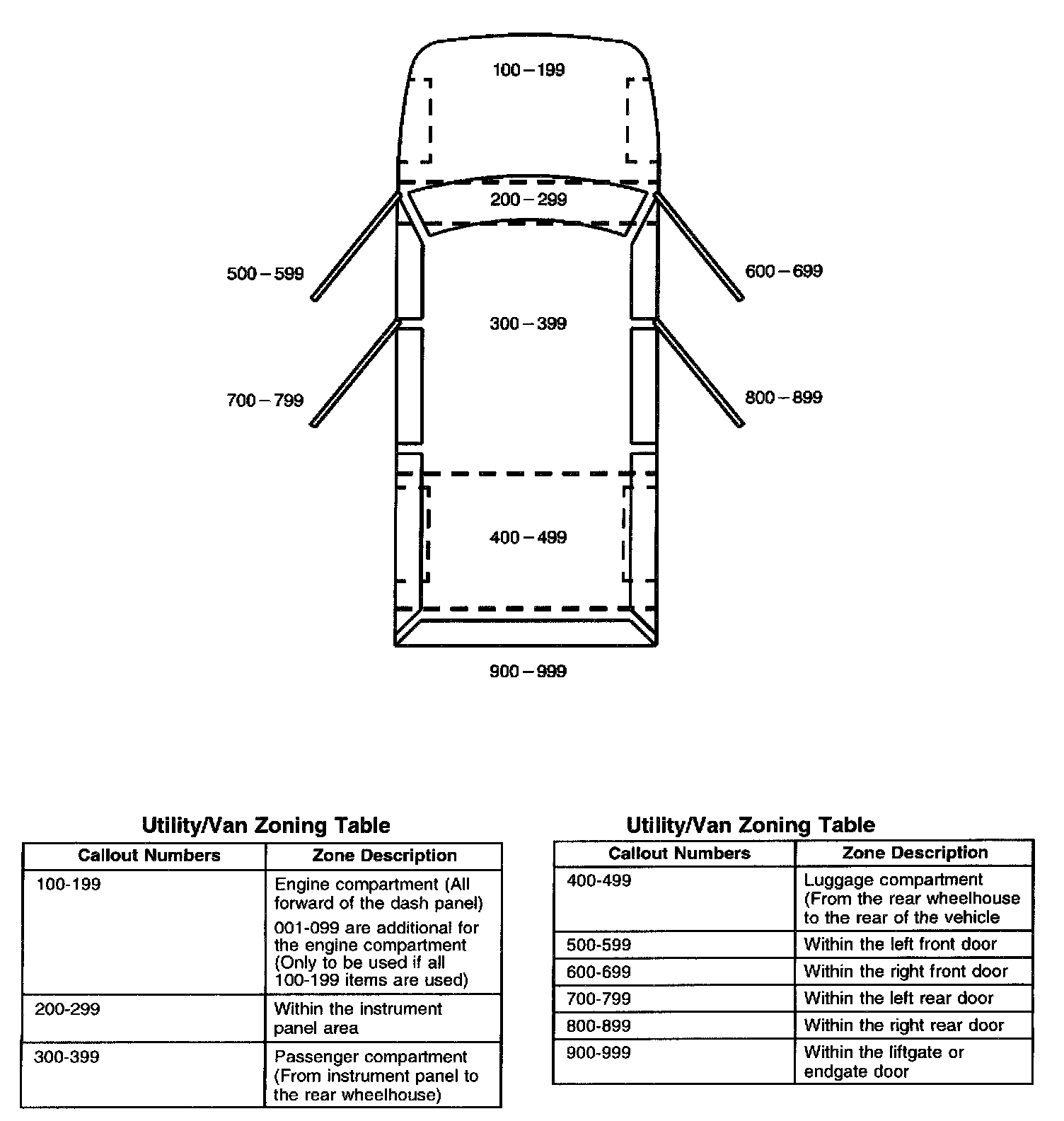 All grounds, in-line connectors, pass-through grommets, and splices have identifying numbers that correspond to where they are located in the vehicle. The following table explains the numbering system.