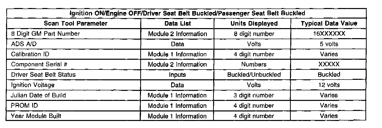 The SIR Scan Tool Data List contains all restraint system related parameters that are available on the scan tool. The parameters in the list are arranged in alphabetical order. The column, "Data List," indicates the location of the parameter within the scan tool menu selections.