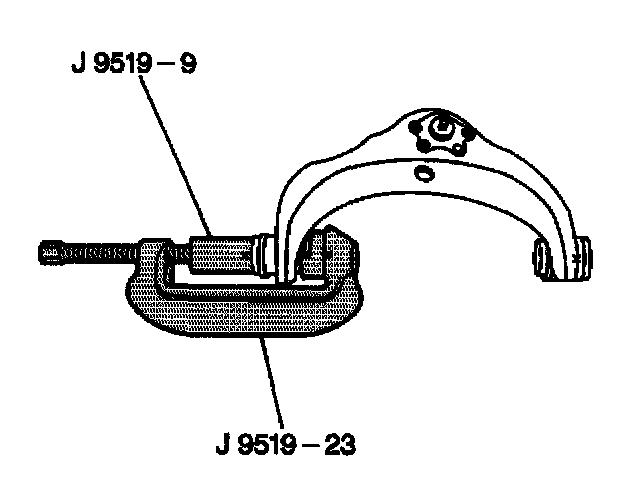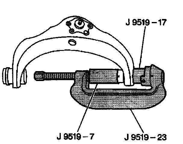 5. Using the J9519-17 as shown remove the upper control arm bushings from the control arm. Remove the tool.
