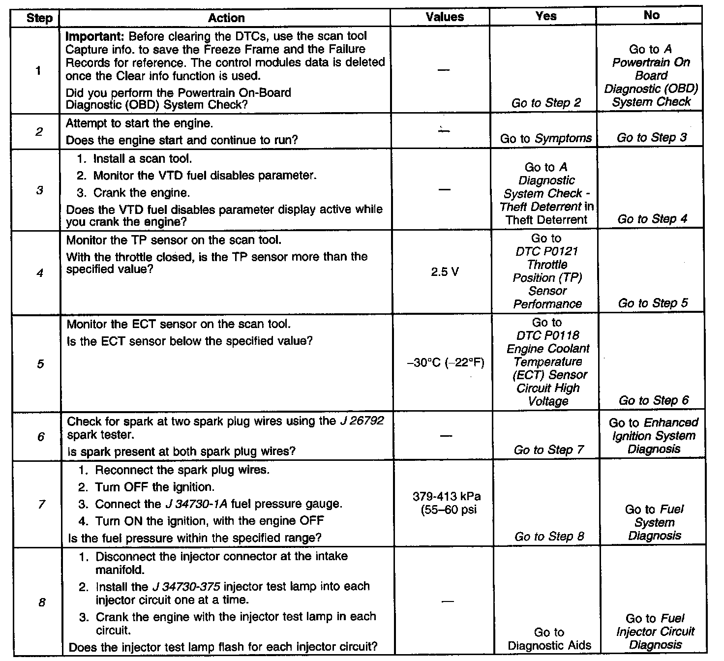 The diagnosis for an engine that cranks but will not run must have three elements present before proceeding with the test table. The battery must be adequately charged. Engine cranking speed must be sufficient and there must be adequate fuel in the tank.