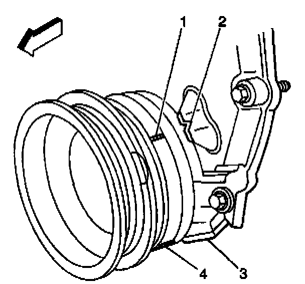 IMPORTANT: Rotate the number 1 cylinder to Top Dead Center (TDC) of the compression stroke. The engine front cover has 2 alignment tabs and the crankshaft balancer has 2 alignment marks (spaced 90 degrees apart) which are used for positioning number 1 piston at top dead center (TDC). With the piston on the compression stroke and at top dead center, the crankshaft balancer alignment mark (1) must align with the engine front cover tab (2) and the crankshaft balancer alignment mark (4) must align with the engine front cover tab (3).