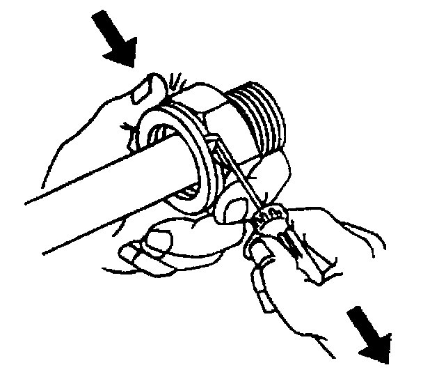 18. If you cannot position the plastic cap against the fitting, remove the retaining ring from the quick connect fitting per Step 5 of the cooler line removal procedure. Check the retaining ring and the tube end in order to ensure neither is bent. Replace the cooler line or the retaining ring if necessary, and reinstall per Step 2 of the cooler line installation procedure.