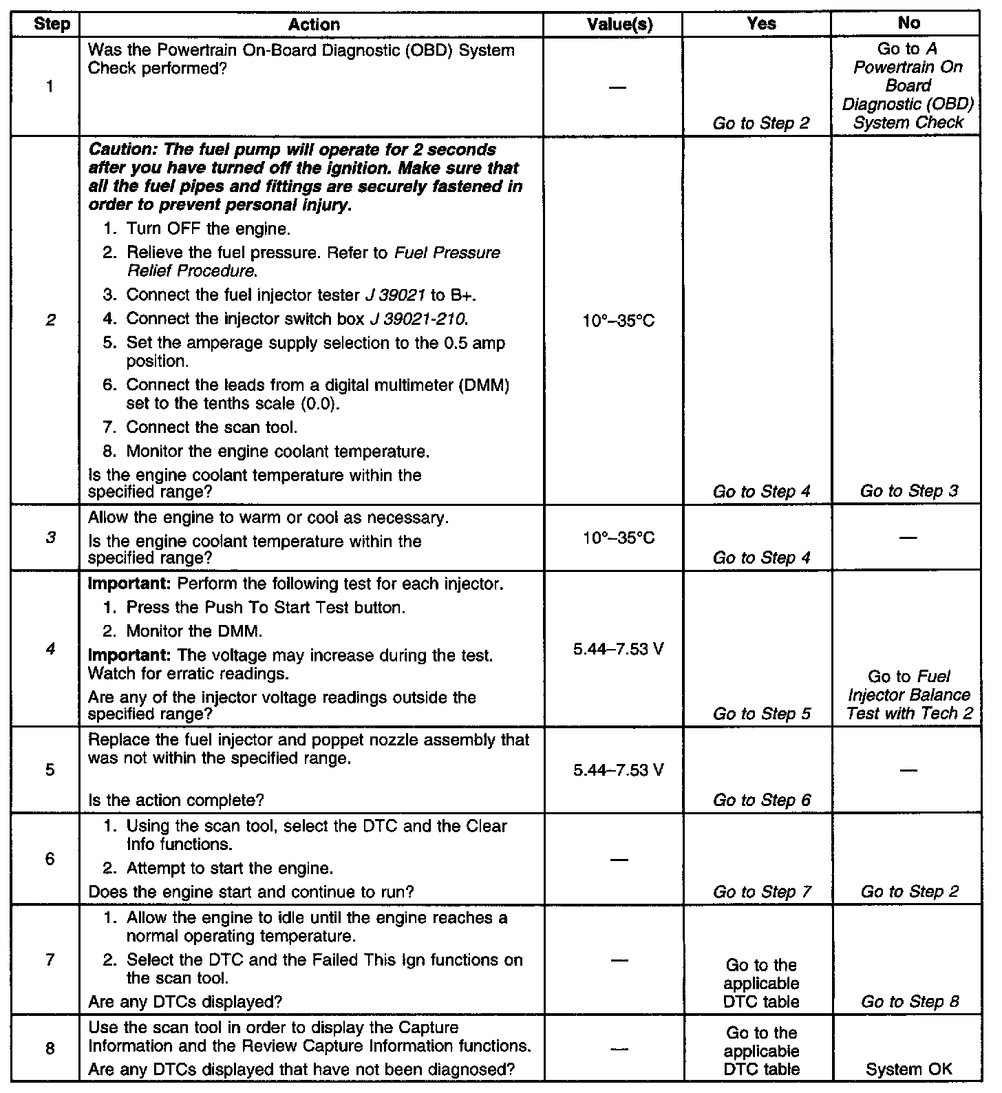 4. Due to a current surge, the first second of the voltage reading may be inaccurate. Therefore, begin recording after the first second of the voltage reading. The voltage specification should be within range. The voltage reading may increase throughout the test as the injector windings warm up and the resistance changes. An erratic voltage reading would indicate an intermittent connection within the fuel injector.