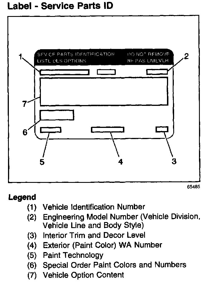 The Service Parts Identification Label aids the service personnel in identifying the parts and options originally installed on the vehicle.