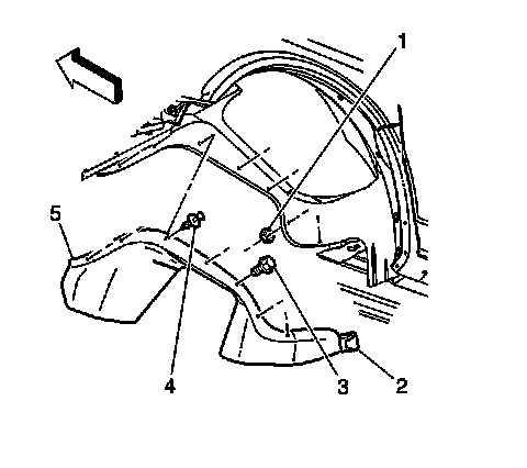 3. Remove the clip (2) retaining the splash shield (5) to the rear of the wheelhouse.