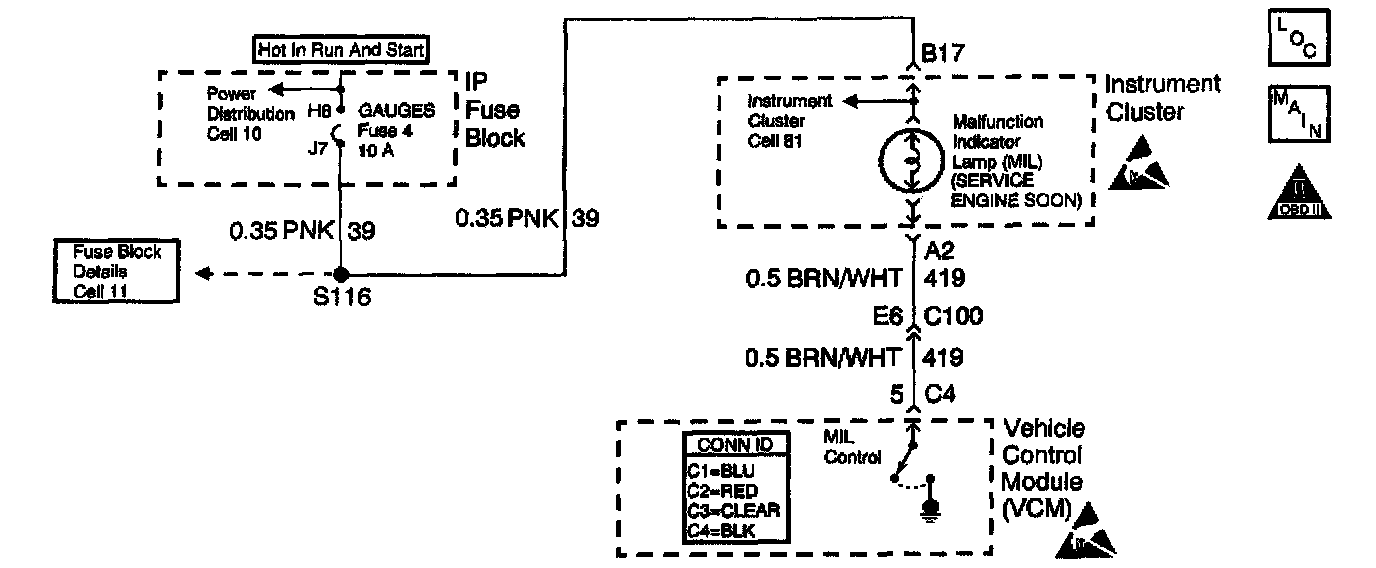 When the ignition switch is initially turned to the run position, the Malfunction Indicator Lamp (MIL) will be ON steady. When the engine is running and there are no active type A or B DTCs stored, refer to Diagnostic Trouble Code (DTC) Type Definitions. The Vehicle Control Module (VCM) turns OFF the MIL. The ignition switch supplies battery voltage directly to the MIL through the gauge fuse. The VCM controls the MIL by providing a ground path through the MIL control circuit in order to turn ON the MIL. Diagnostic Trouble Code Descriptions