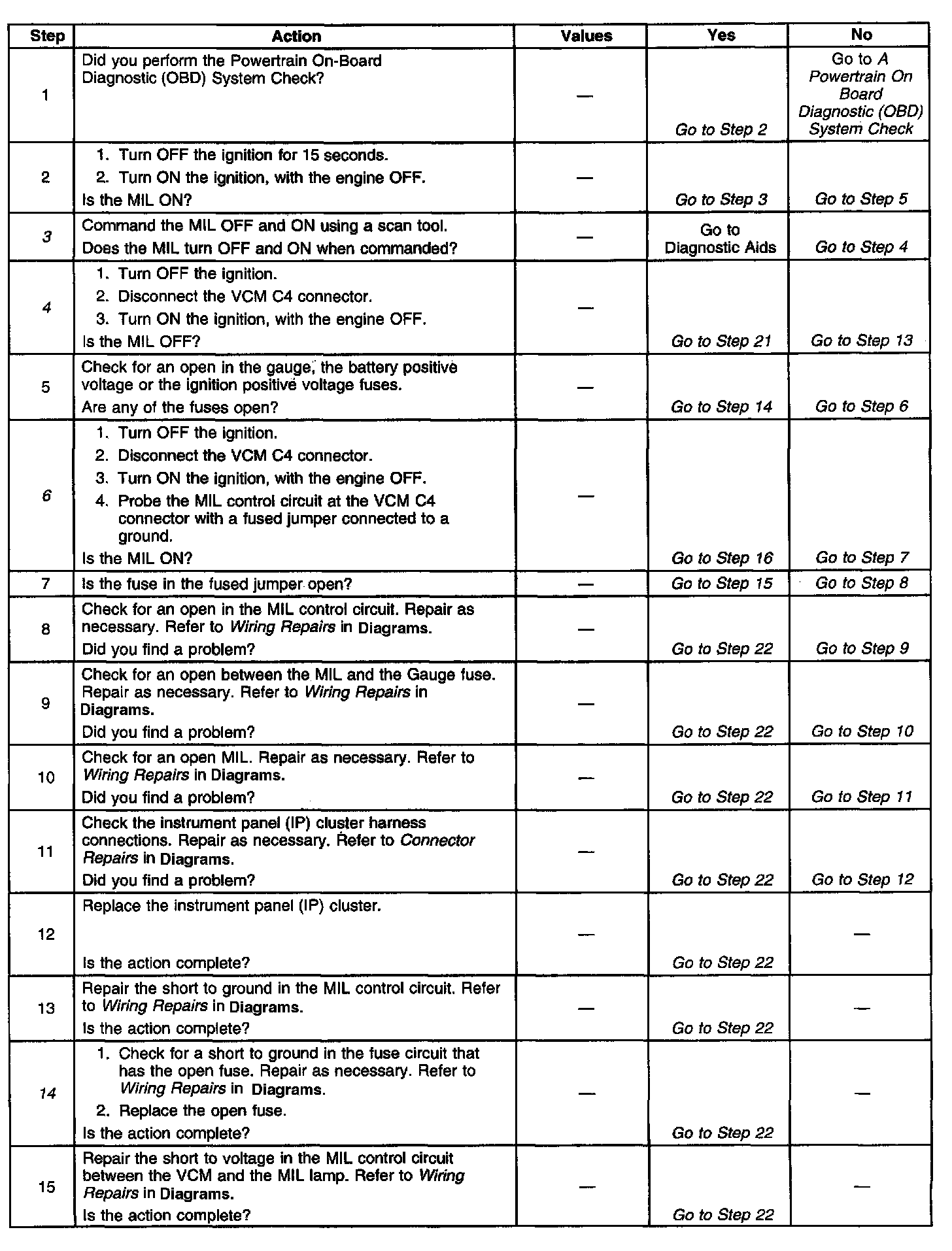 4. The MIL should be OFF. This step checks for a short to ground in the MIL control circuit by removing the VCM from the circuit.