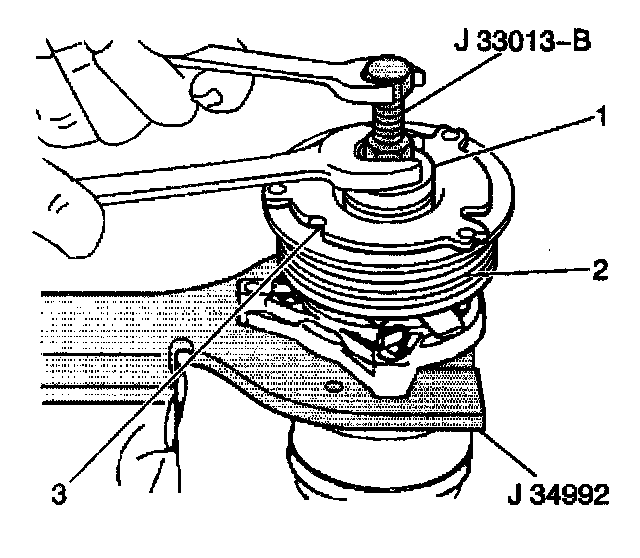 NOTE: Do not drive or pound on the clutch hub or shaft. Internal damage to the compressor may result. The forcing tip on the J 33013-B remover/installer center screw must be flat or the end of the shaft/axial plate assembly will be damaged.