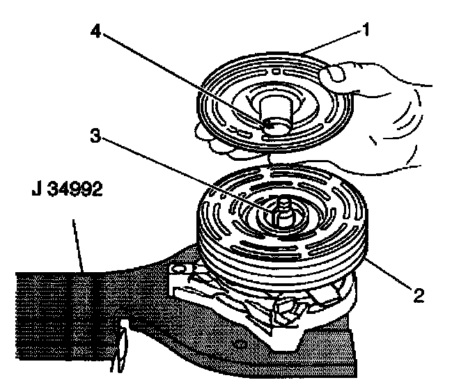 5. Place the clutch plate and the hub assembly (1) onto the compressor shaft.