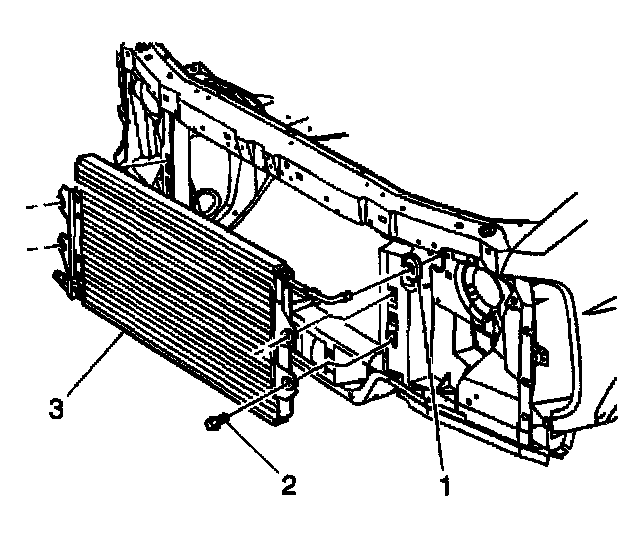 1. Install the condenser (3) and the retaining bolts to the vehicle.