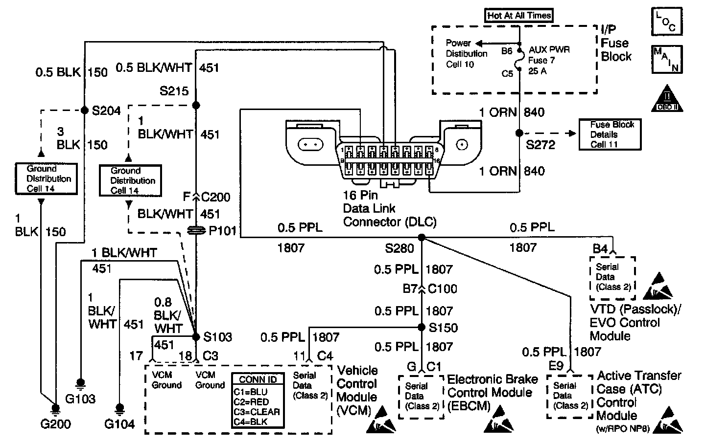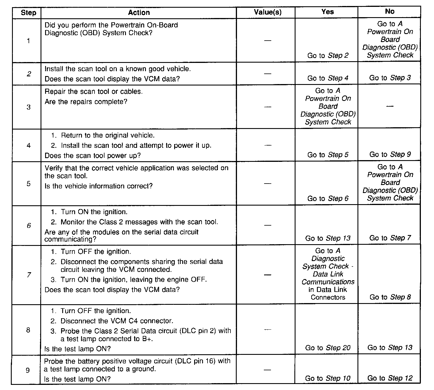 The Class II Serial Data circuit to the Data Link Connector (DLC) allows bi-directional communication between the Vehicle Control Module (VCM) and the scan tool. This is accomplished through pin 2 of the DLC. If communication between the scan tool and the VCM cannot be established, the procedure in the DLC Diagnosis table should be used to diagnose the condition.