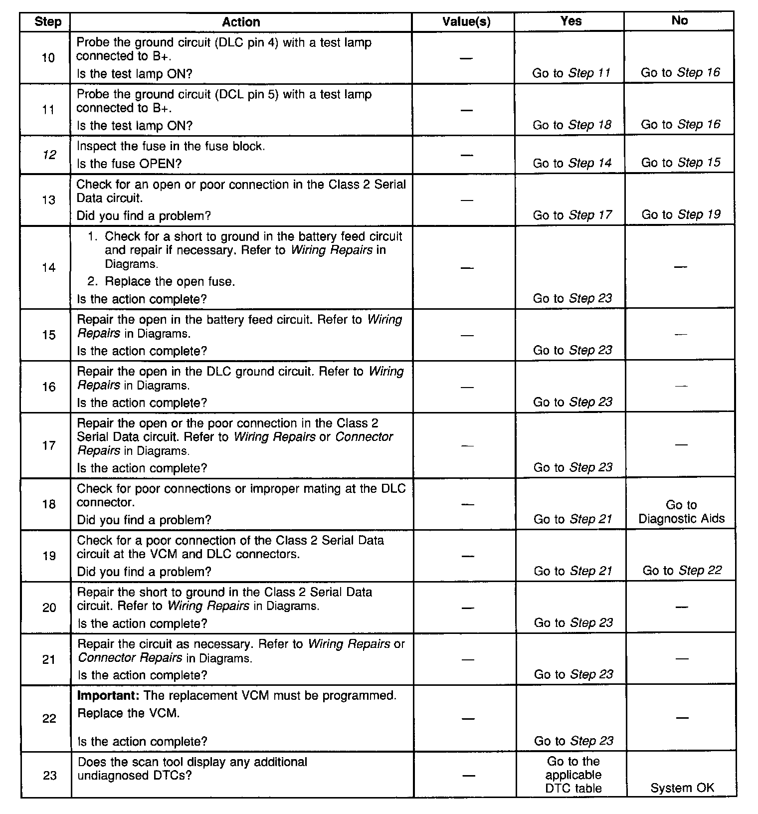 7. This step isolates the VCM by disconnecting all the other components on the Class 2 Serial Data circuit. After making repairs, it is necessary to clear the DTCs from the modules that can communicate. Clearing the DTCs will avoid future misdiagnoses.