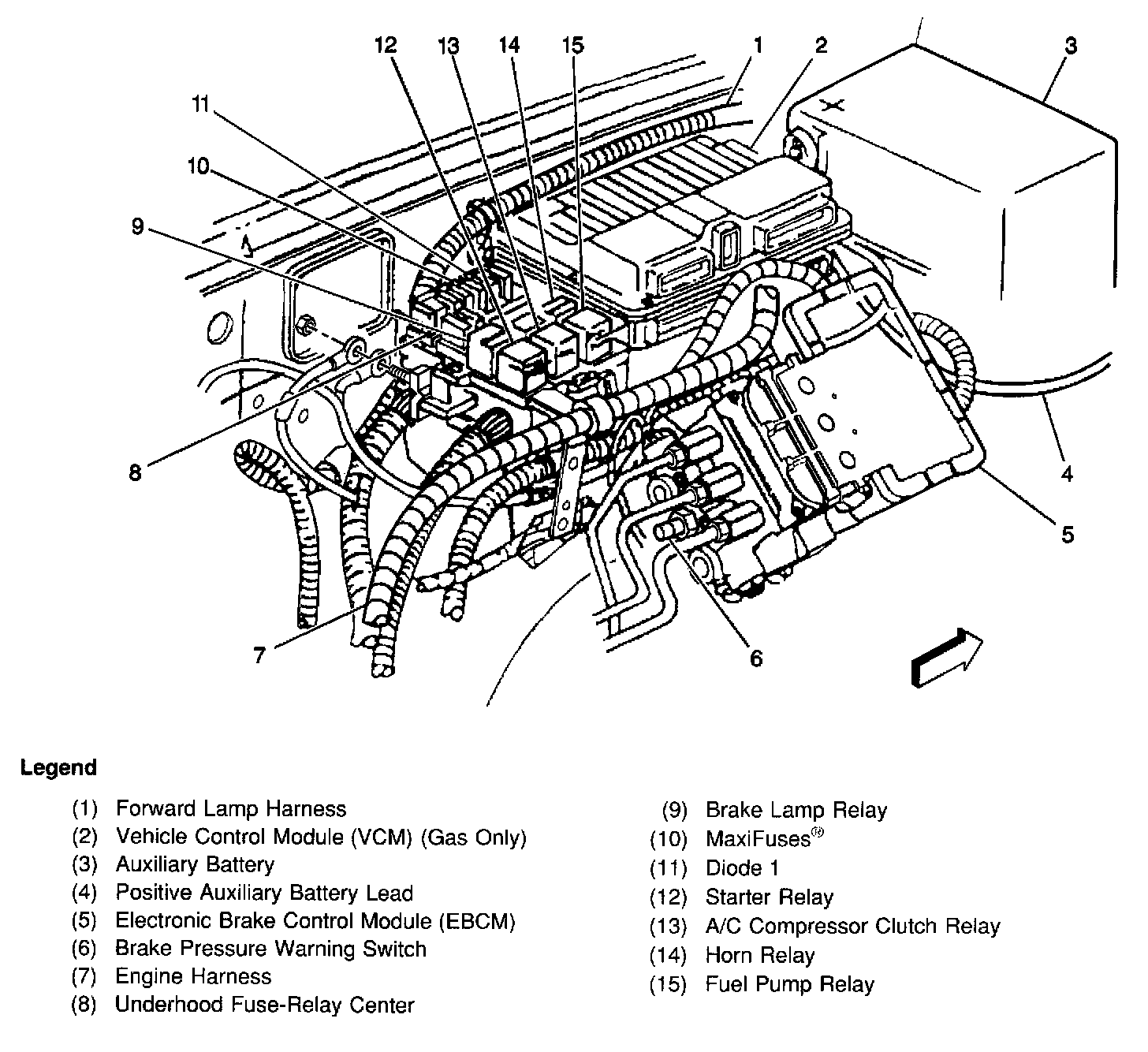 The Fuel Pump Relay is located in the Underhood Fuse Block, LR of Engine Compartment, on Fender.