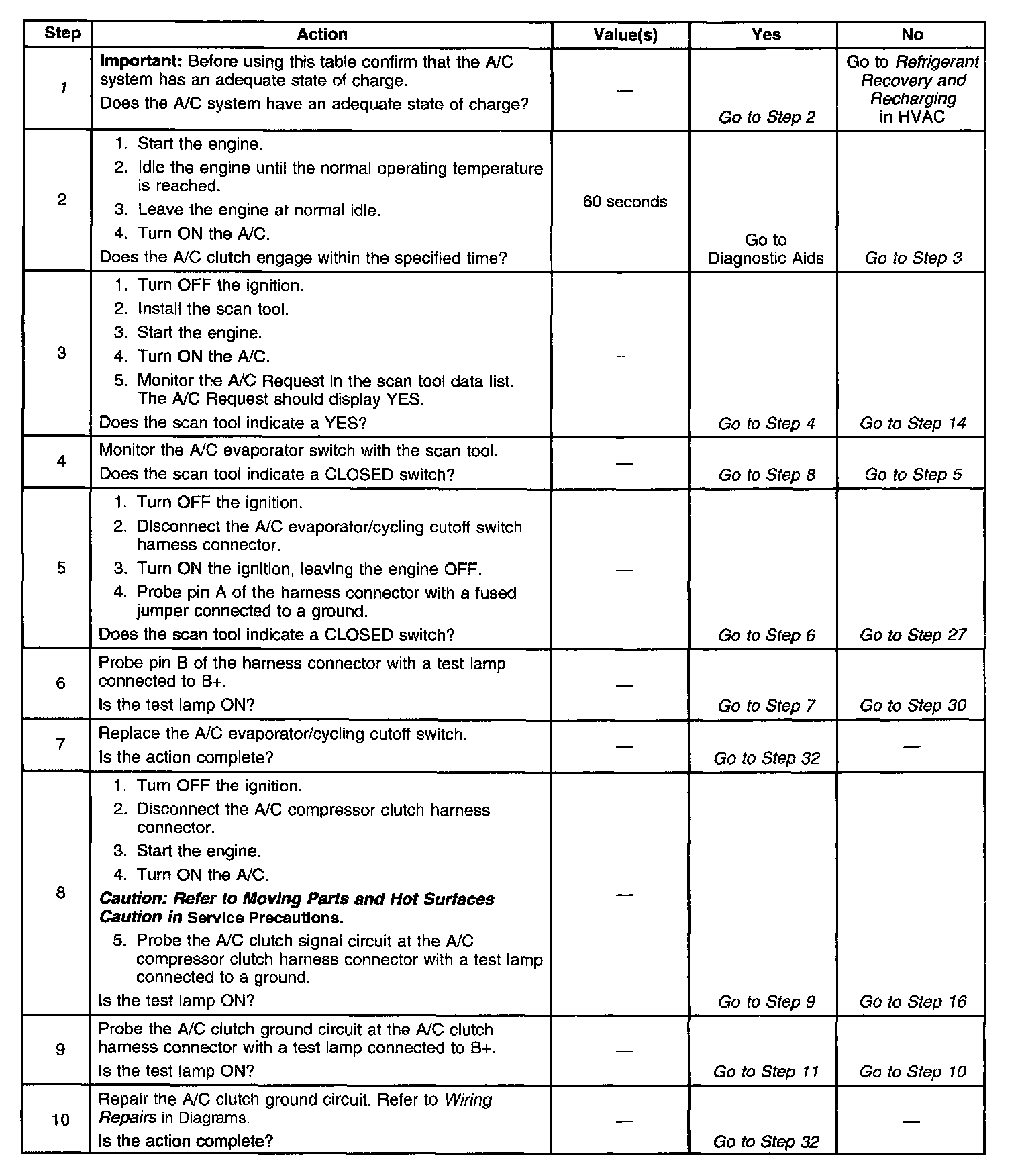 The numbers below refer to the step numbers on the diagnostic table.
