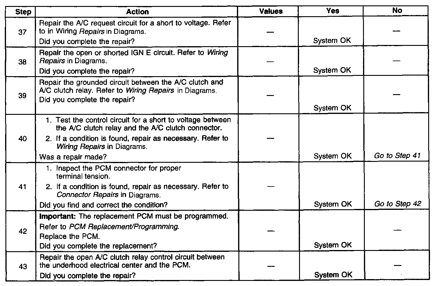 19. This step tests for a short between the A/C relay control circuit and any other circuit in the PCM harness connector.