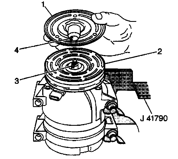 3. Align the shaft key with the shaft keyway in the clutch plate and the hub assembly and place onto the compressor shaft (3).