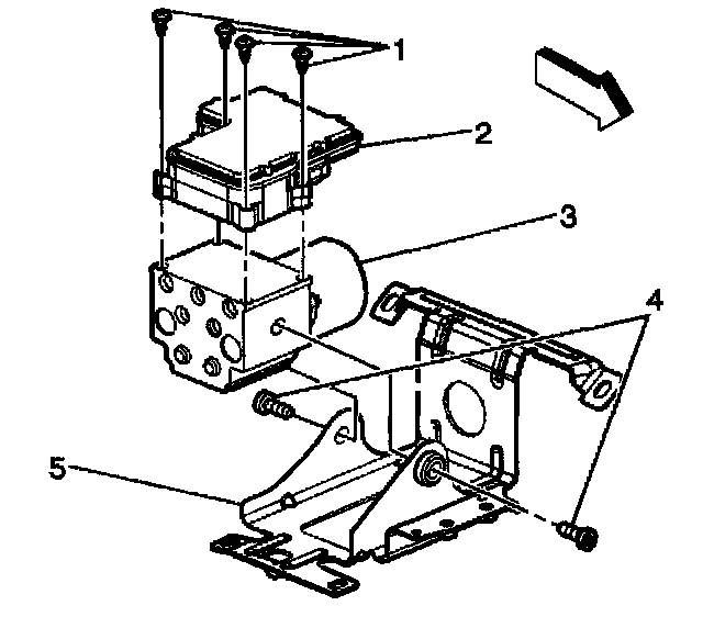 2. Remove the four T 25 Torx mounting screws (1) that fasten the EBCM (2) to the BPMV (3).