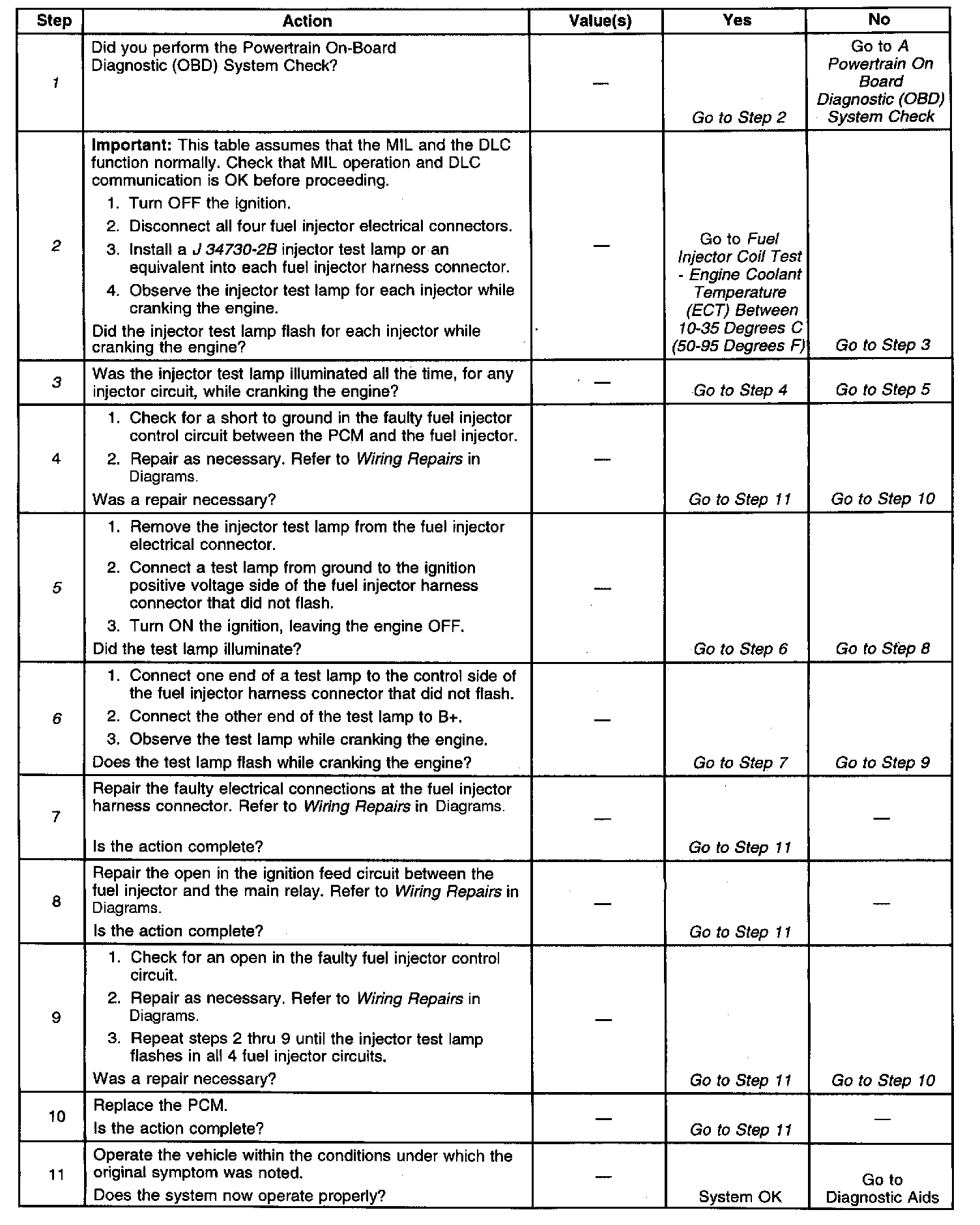 6. This step checks for an open in fuel injector control circuit or for a faulty PCM.