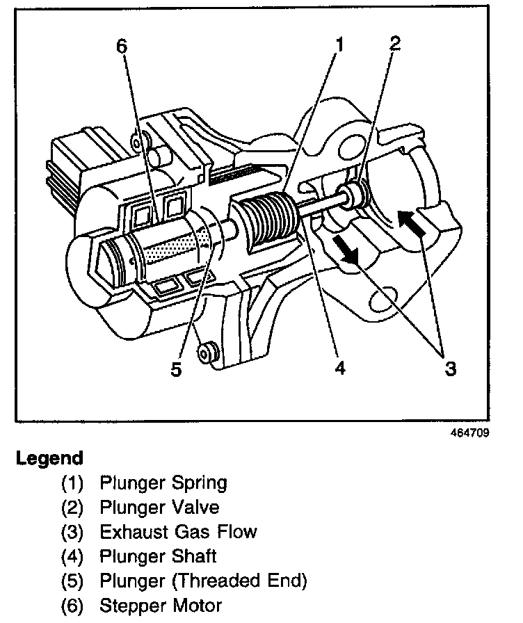 The EGR valve is a stepper motor design. A stepper motor (6) drives a worm gear, that is in mesh with a spring (1) loaded plunger (5). The valve (2) end of the plunger (4) controls the flow of exhaust gases (3). The plunger movement is controlled by the Powertrain Control Module (PCM). By turning the stepper motor in different directions, the PCM controls the opening of the exhaust gas passage to the intake manifold.