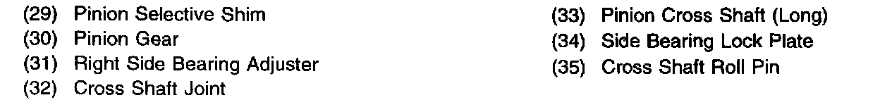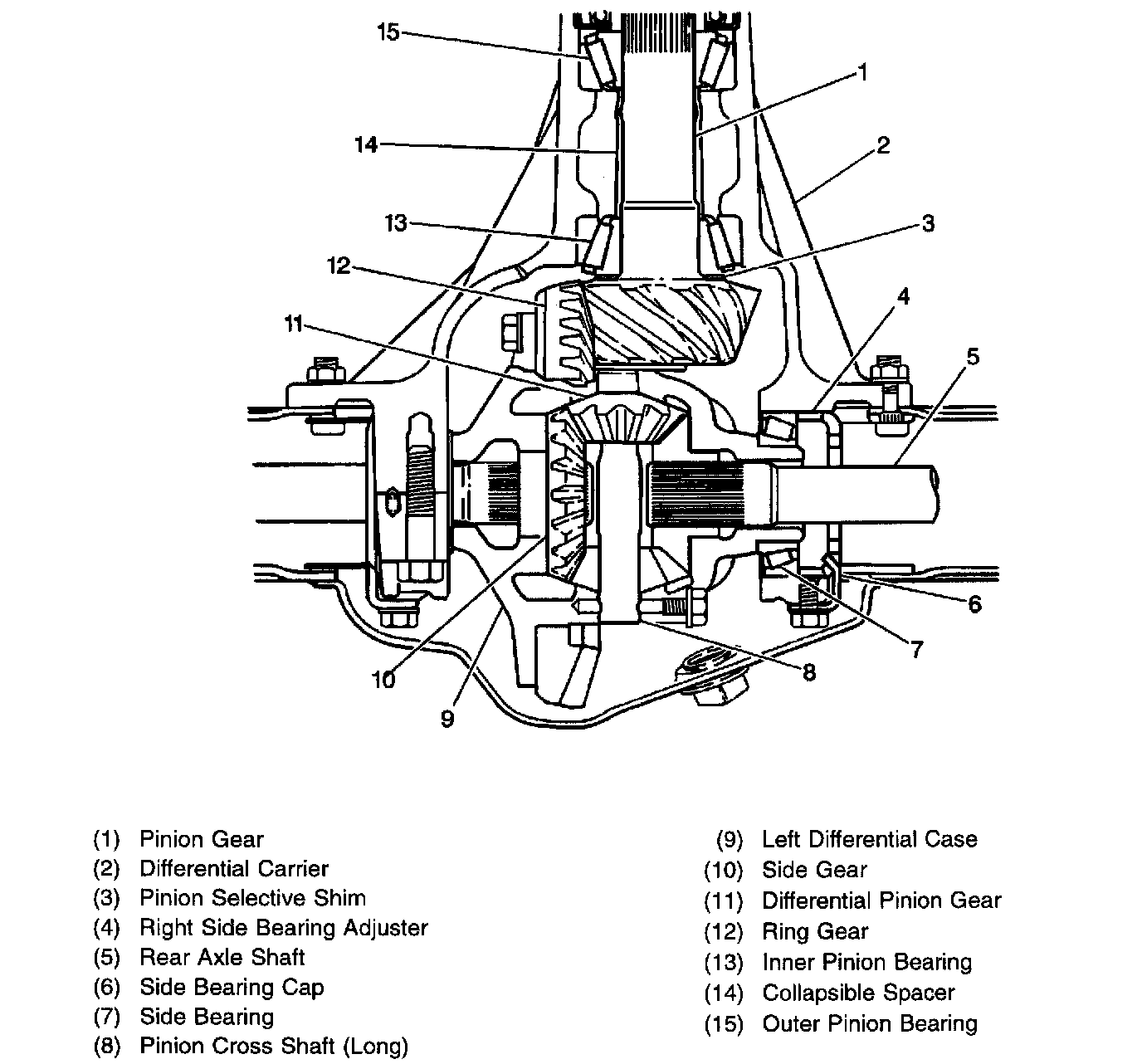 The differential pinion gears are mounted on a pinion cross shaft (8) and are free to rotate on it. The pinion shaft is fitted into a bore in the differential case and is held in place by a pinion shaft roll pin. The differential case is mounted in the differential carrier where the pinion gear drives the ring gear, differential case, and the side and differential pinion gears. The differential carrier is mounted near the center of the rear axle housing. For removal and installation procedures, refer to Differential Carrier Replacement.