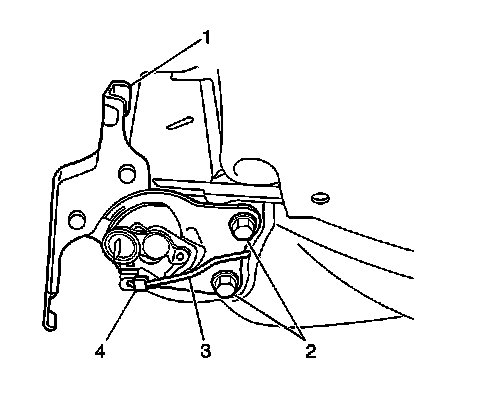 2. Install the rear seat back hinge rod (3) to the seat recliner (1). Close the rear seat hinge torque rod clamp (4).