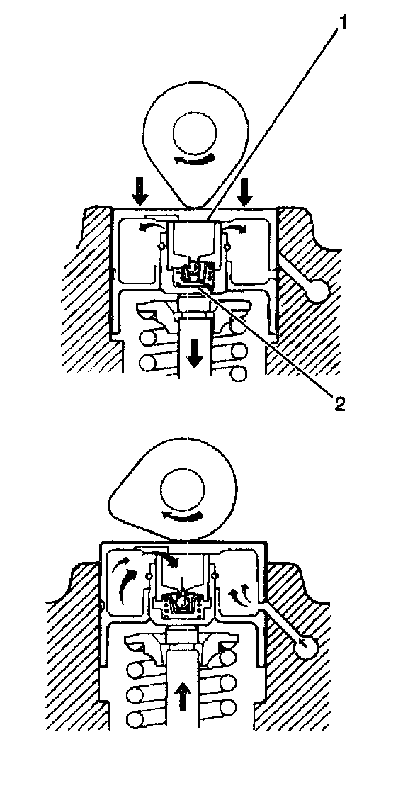 1. When the camshaft is not depressing the HVL adjuster, the adjuster is held against the camshaft and the valve! stem by the plunger spring. In this state, the valve lash is kept at 0. (At 0 valve lash, the oil pressure becomes equal in the A (1) and B (2) chambers, and the check ball closes the passage between these two chambers.