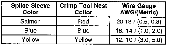 Use crimp and seal splice sleeves to form a one-to-one splice on all types of insulation except tefzel and coaxial to form a one-to-one splice. Use tefzel and coaxial where there is special requirements such as moisture sealing. Follow the instructions below in order to splice copper wire using crimp and seal splice sleeves.Crimp and Seal Splice Table