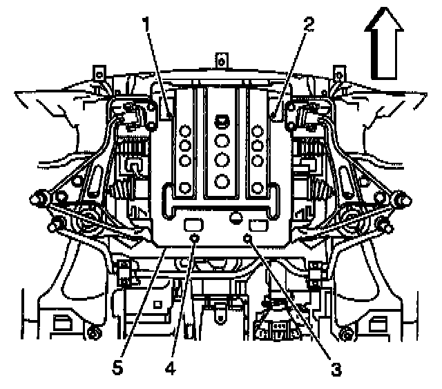 3. Install the steering linkage skid plate (5) to the vehicle by raising and sliding rearward onto the retaining hook, if equipped. Secure the skid plate with the 4 bolts (1,2,3,4).