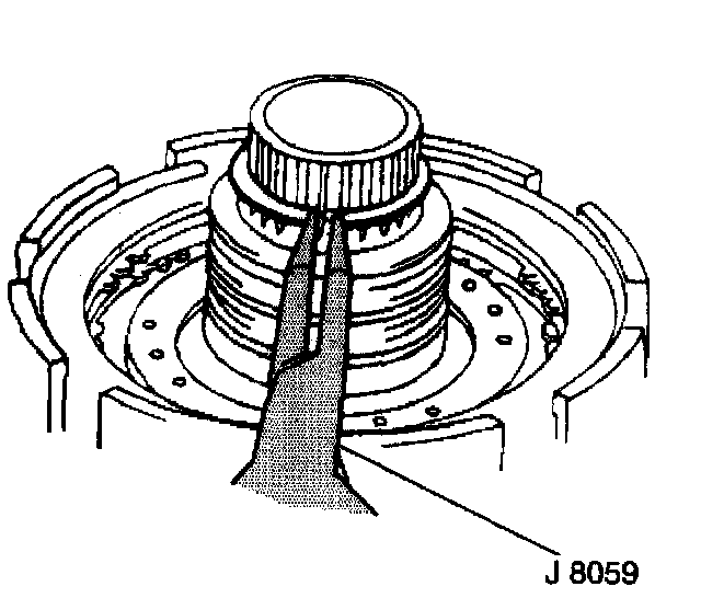 7. Remove the B1 brake piston return spring snap ring from the 131 brake piston retainer using J 41681 and a hydraulic press.