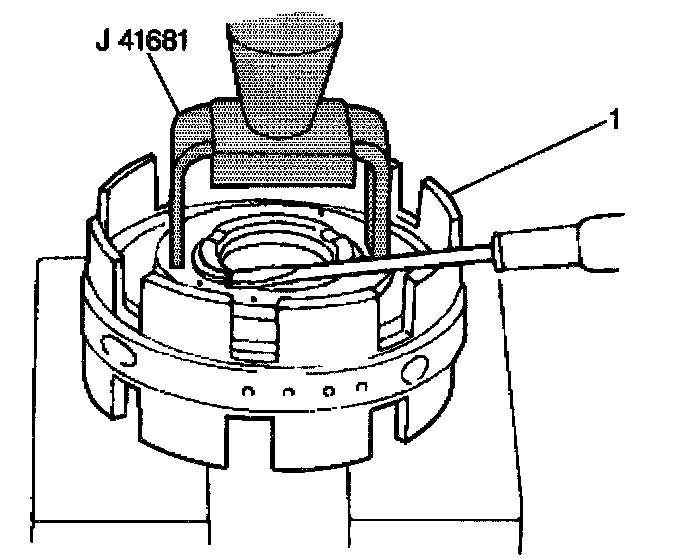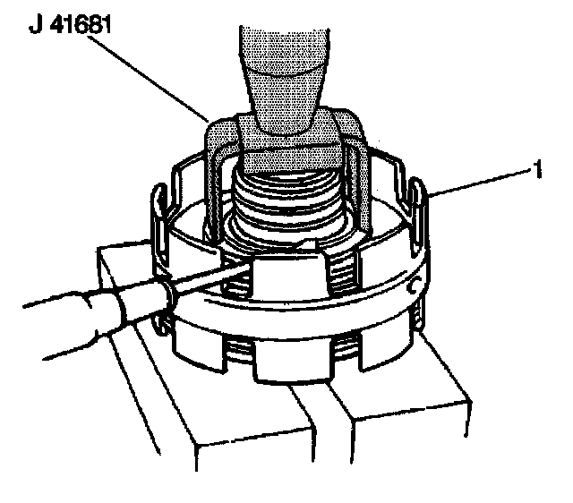 17. Install the B1 brake piston return spring snap ring onto the B1 brake piston return spring retainer using J 41681 and a hydraulic press.