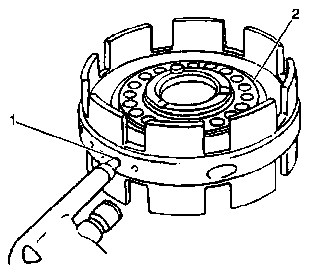5. Remove the B1 brake clutch snap ring (2) from the center support (1) using a flathead screwdriver.