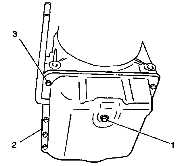 9. Remove the 14 transmission fluid pan bolts (3) from the transmission fluid pan.