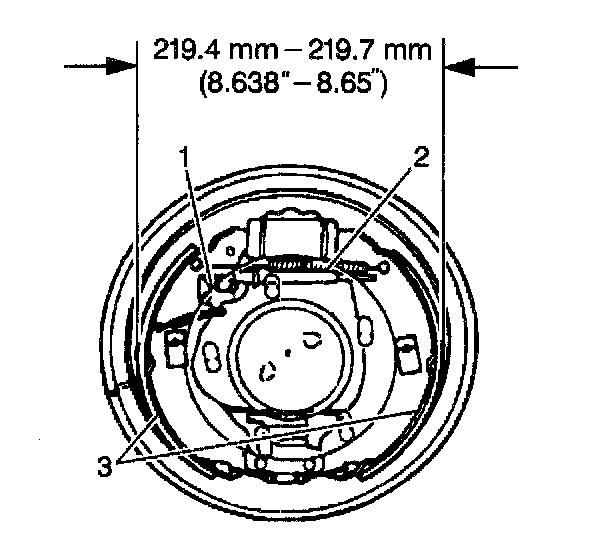 9. If the outer diameter of the brake shoes is not within specification, turn the adjuster (2).
