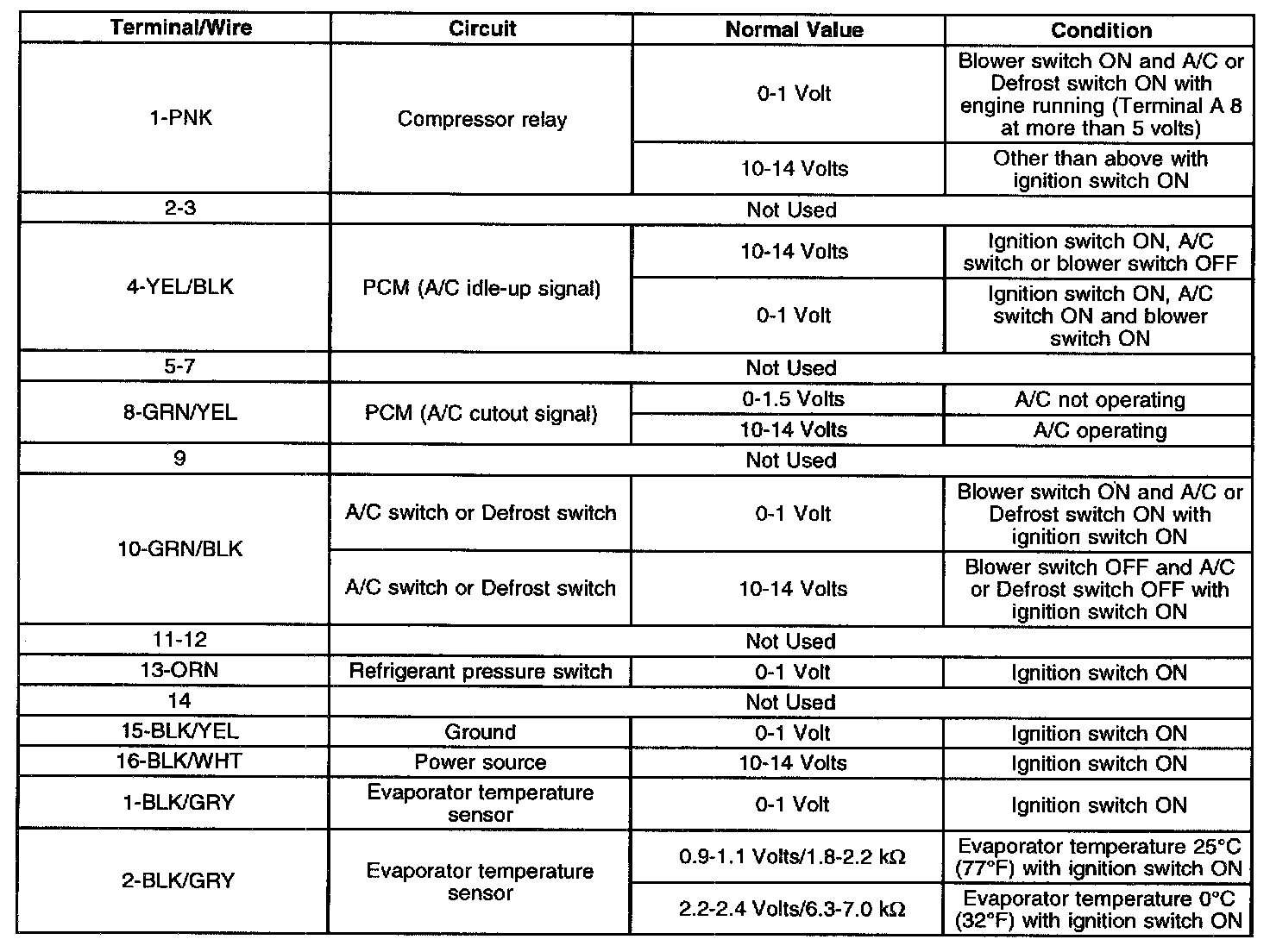 Compressor Control Module Voltage Table: