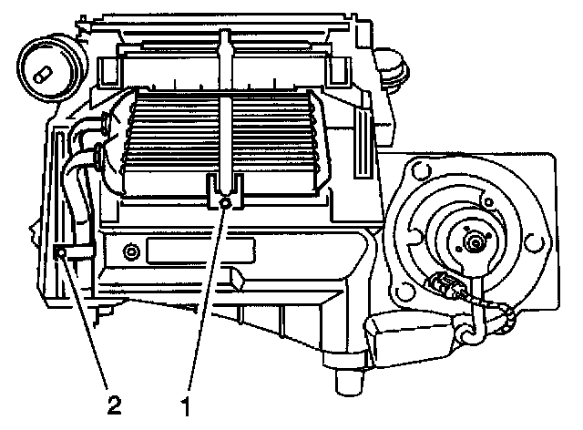 16. Remove and discard the heater core upper seal (2) from the HVAC module case.
