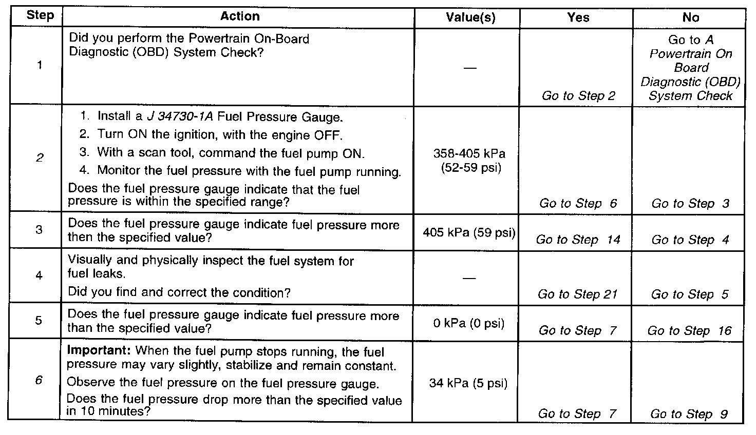 9. Fuel pressure that drops-off during acceleration, cruise, or hard cornering may cause a lean condition. A lean condition can cause a loss of power, surging, or misfire and may be diagnosed using a scan tool. If an extremely lean condition occurs, the oxygen sensors may drop below 500 mV and the fuel injector pulse width will increase.