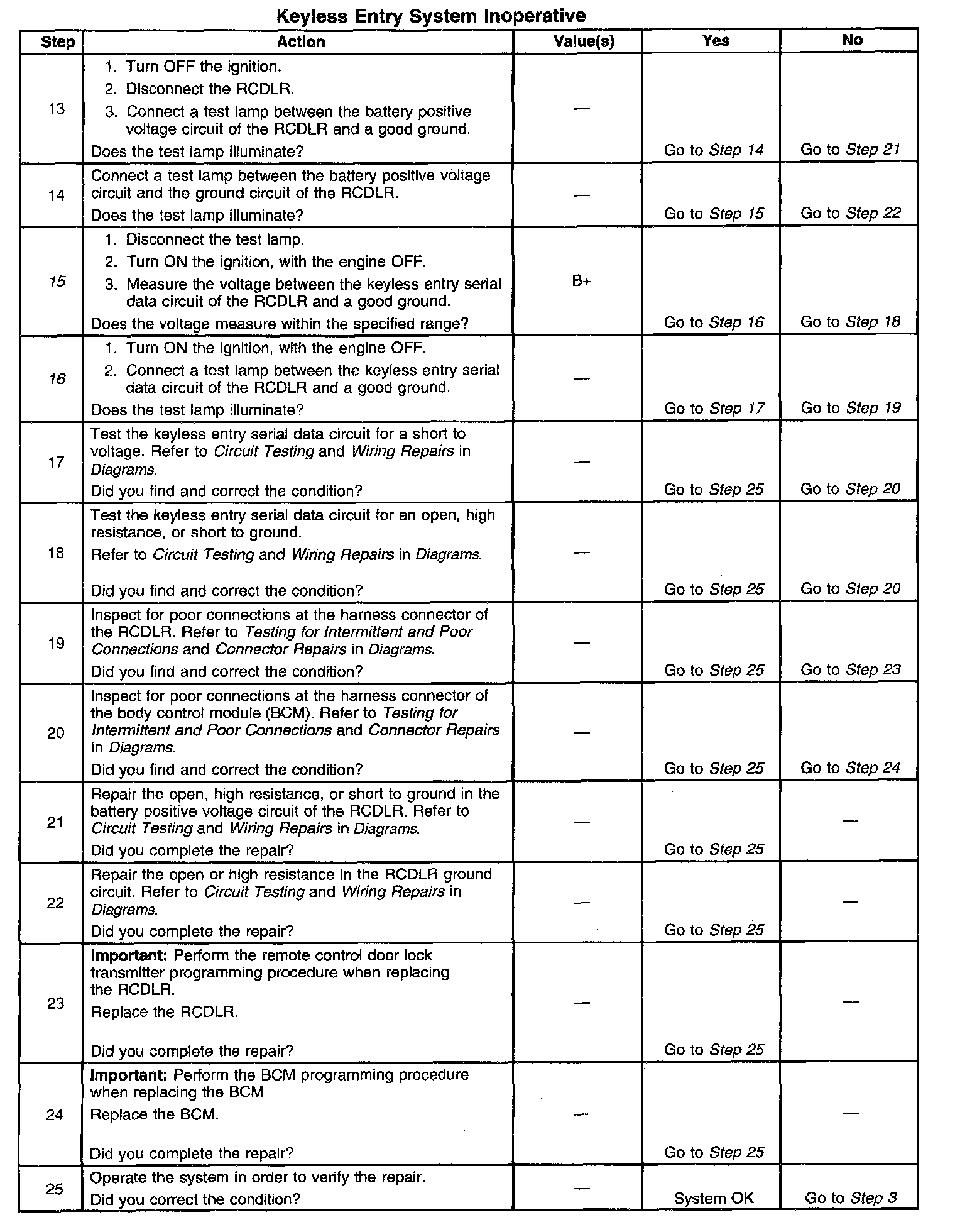 15. This step verifies that the keyless entry serial data circuit voltage is B+ as supplied by the BCM.