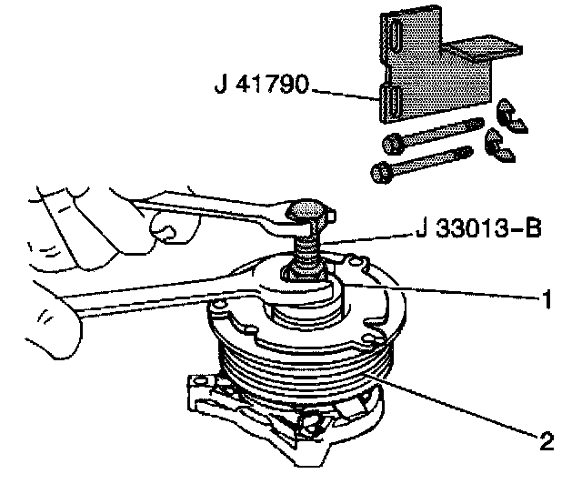 NOTE: Do not drive or pound on the clutch hub or shaft. Internal damage to the compressor may result. The forcing tip on the J 33013-B remover/installer center screw must be flat or the end of the shaft/axial plate assembly will be damaged.