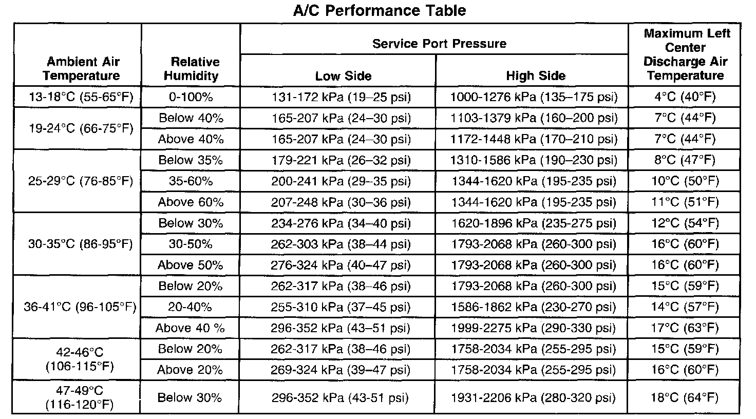 A/C Performance Table: