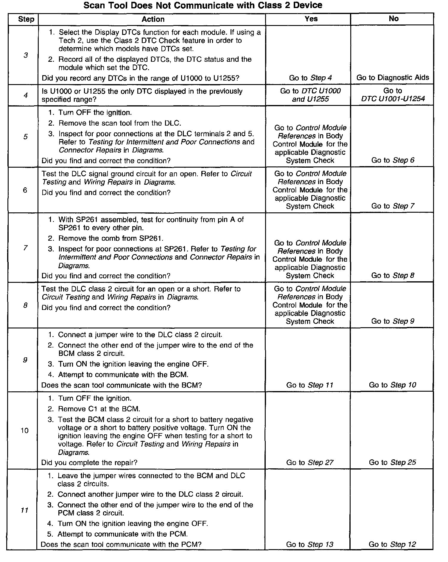 8. An open in the class 2 serial data circuit between the DLC and SP261 will prevent the scan tool from communicating with any module. This condition will not set a DTC.