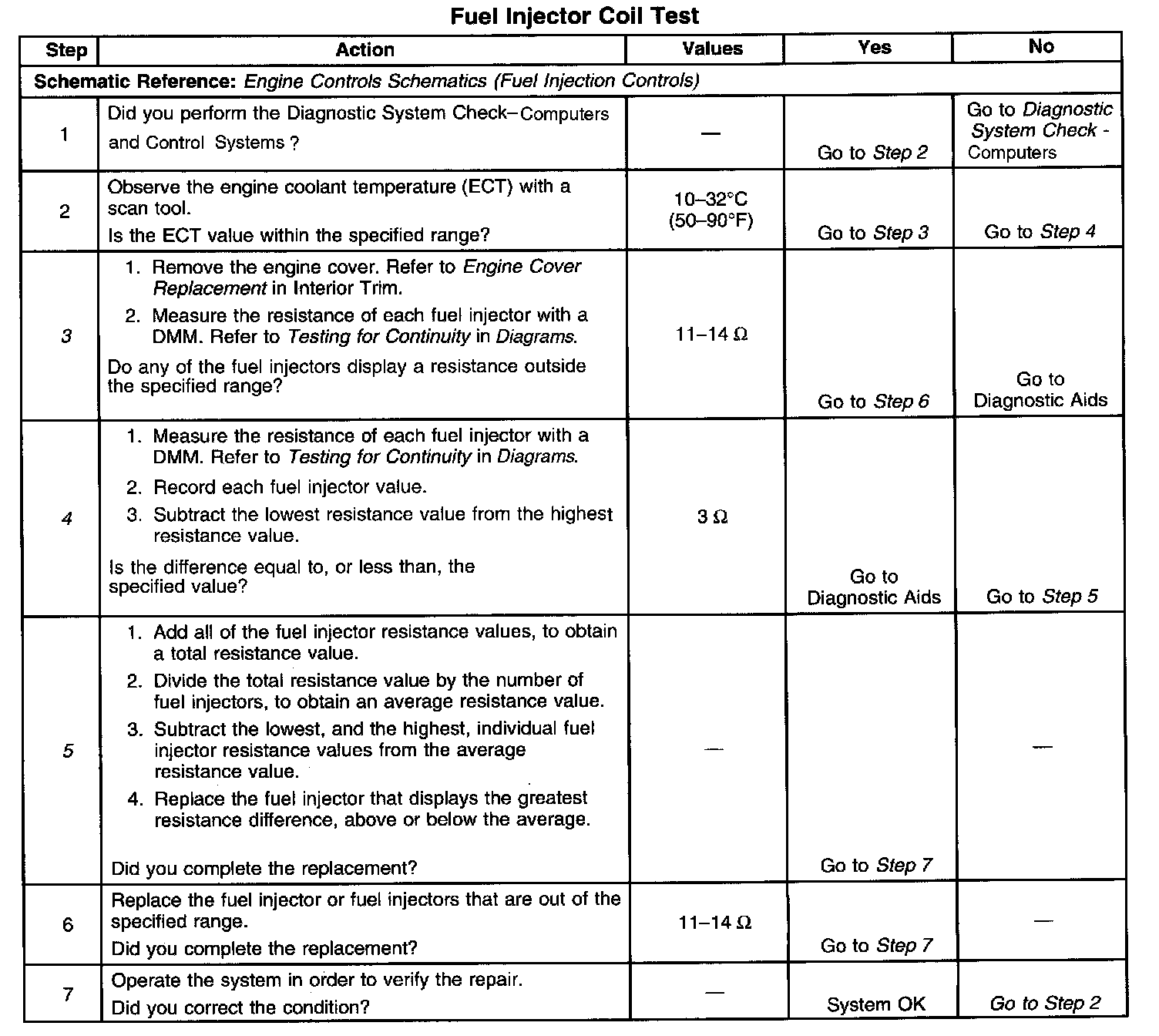 ^ Perform the fuel injector coil test within the conditions of the customers concern. A fuel injector condition may only be apparent at a certain temperature, or under certain conditions.