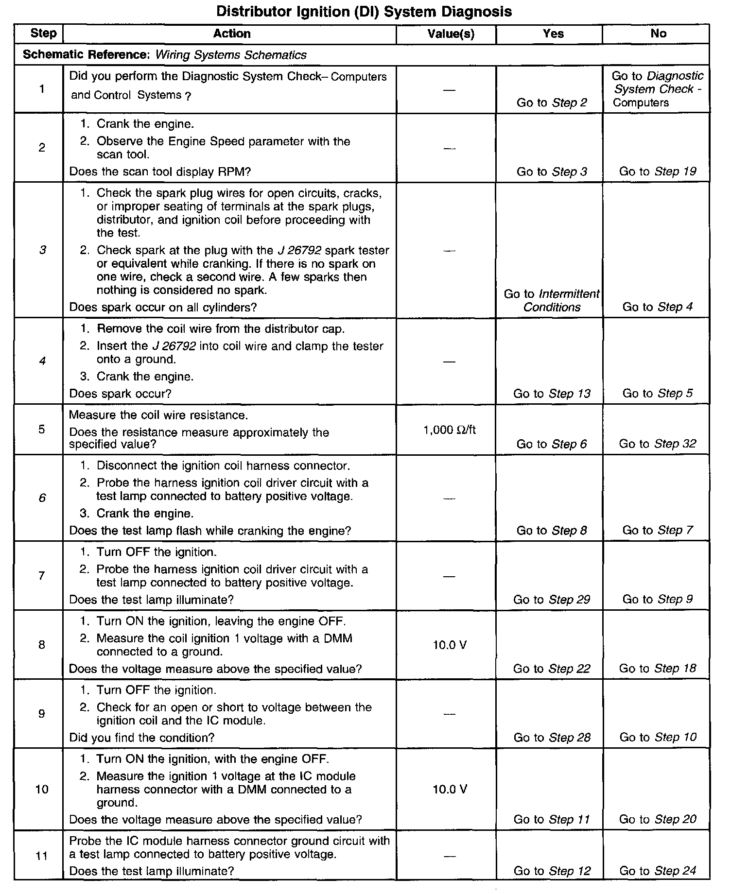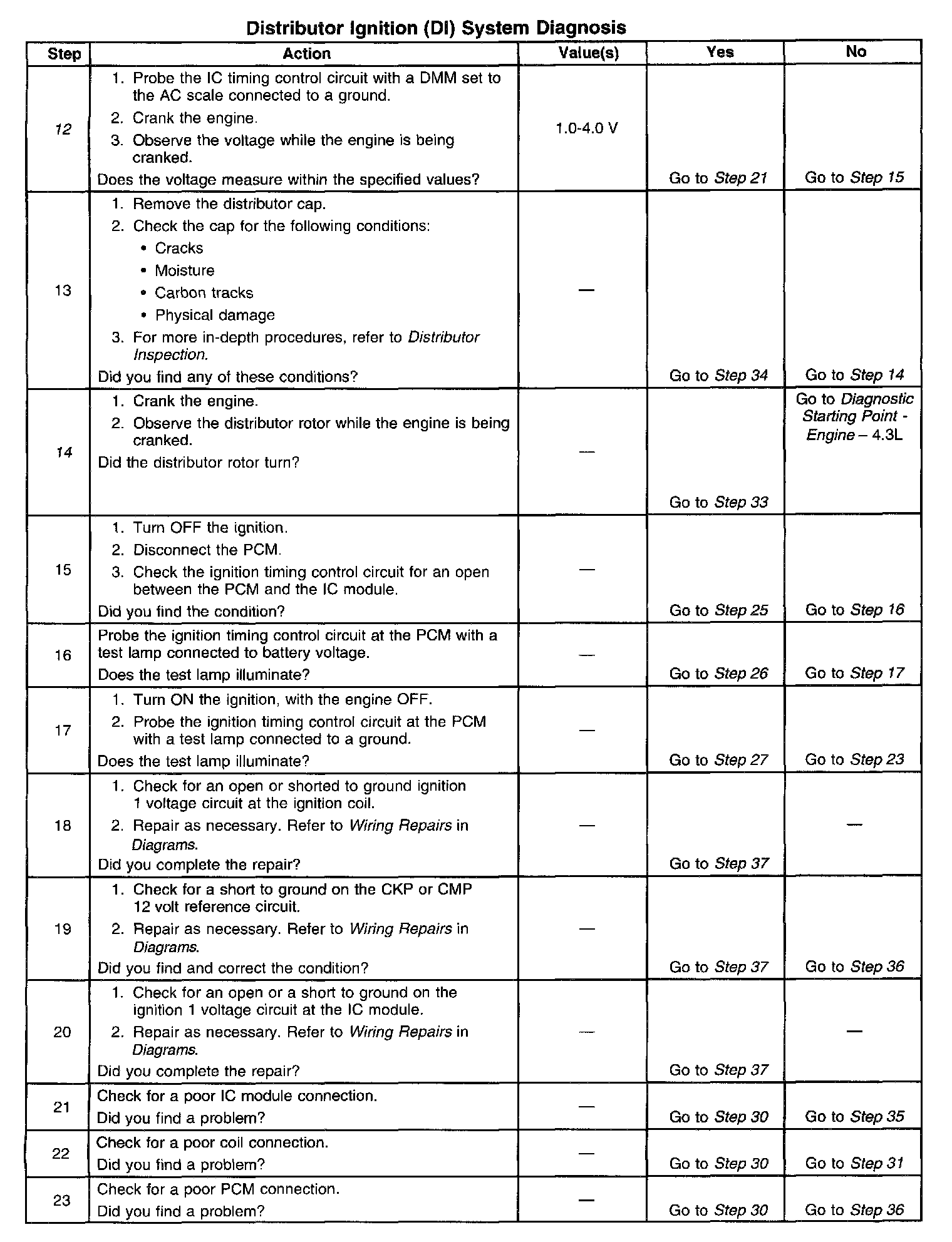 12. This test begins to determine if the PCM is providing a signal to the ignition control module. If the PCM is not providing a signal to the ignition control module, the problem exists between the ignition control module and the PCM.