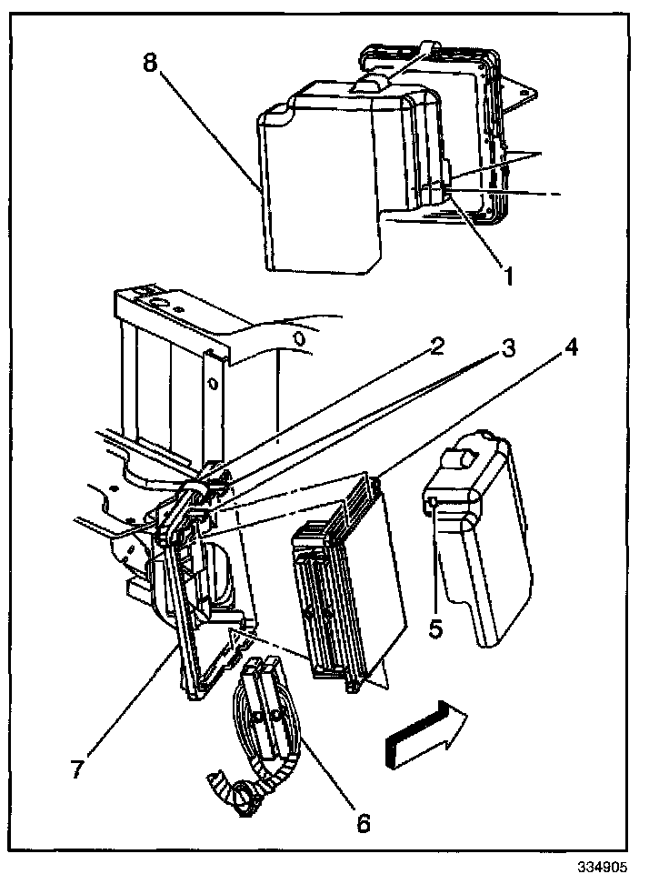 4. Install the PCM cover (8) to the PCM mounting bracket (7), ensuring the mounting tabs on the PCM mounting bracket are engaged into the mounting holes in the PCM cover.