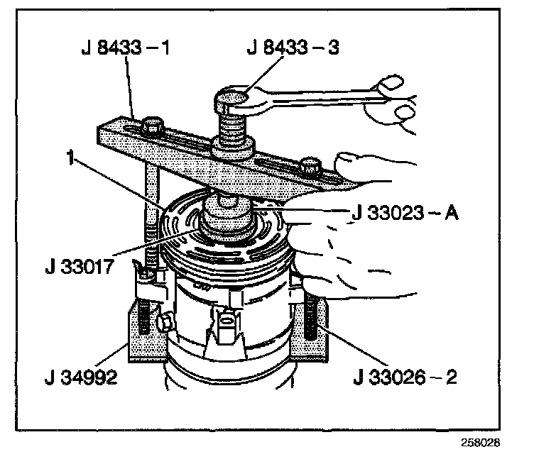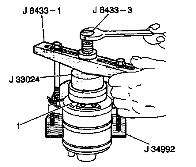 8. Turn the center forcing screw of the J 8433-1 in order to force the clutch coil onto the front head. Ensure that the clutch coil and the J33024 remain aligned during installation.