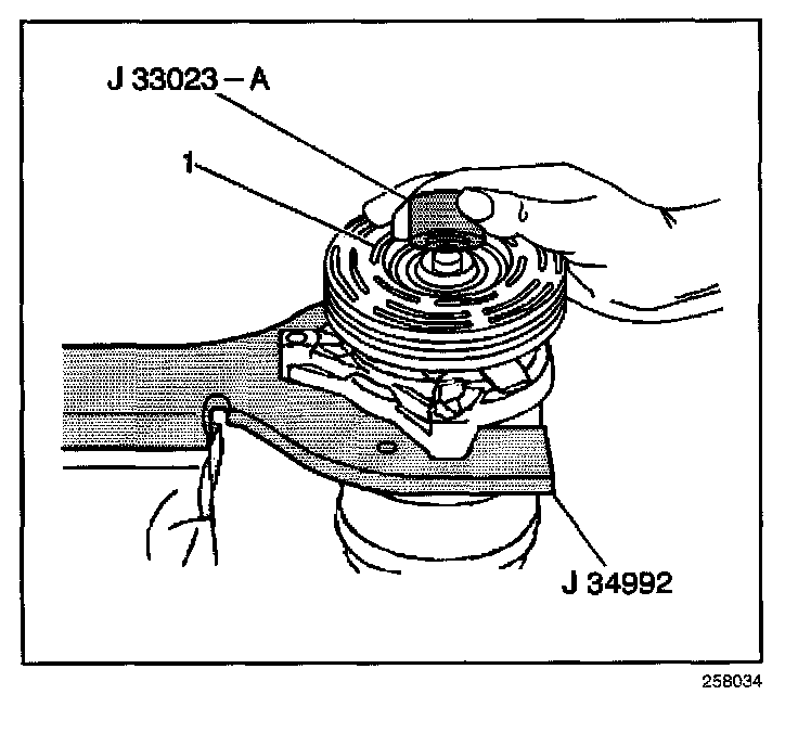 11. With the compressor mounted to the J 34992, position the pulley rotor (1) and bearing assembly on the front head.