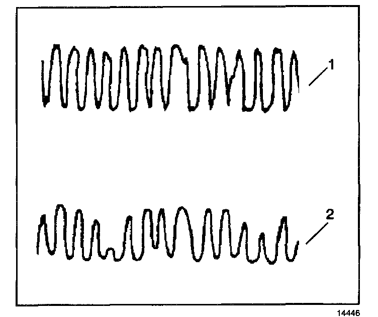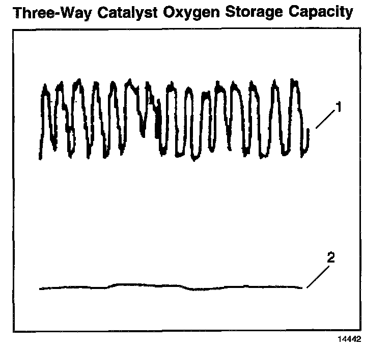 The PCM must monitor the three-way catalyst system (TWC) for efficiency. In order to accomplish this, the PCM monitors the pre-catalyst and post-catalyst oxygen sensors. When the TWC is operating properly, the post-catalyst (2) oxygen sensor shows significantly less activity than the pre-catalyst (1) oxygen sensor. The TWC stores oxygen during the normal reduction and oxidation process. The TWC releases oxygen during its normal reduction and oxidation process. The PCM calculates the oxygen storage capacity using the difference between the pre-catalyst and post-catalyst oxygen sensor voltage levels.