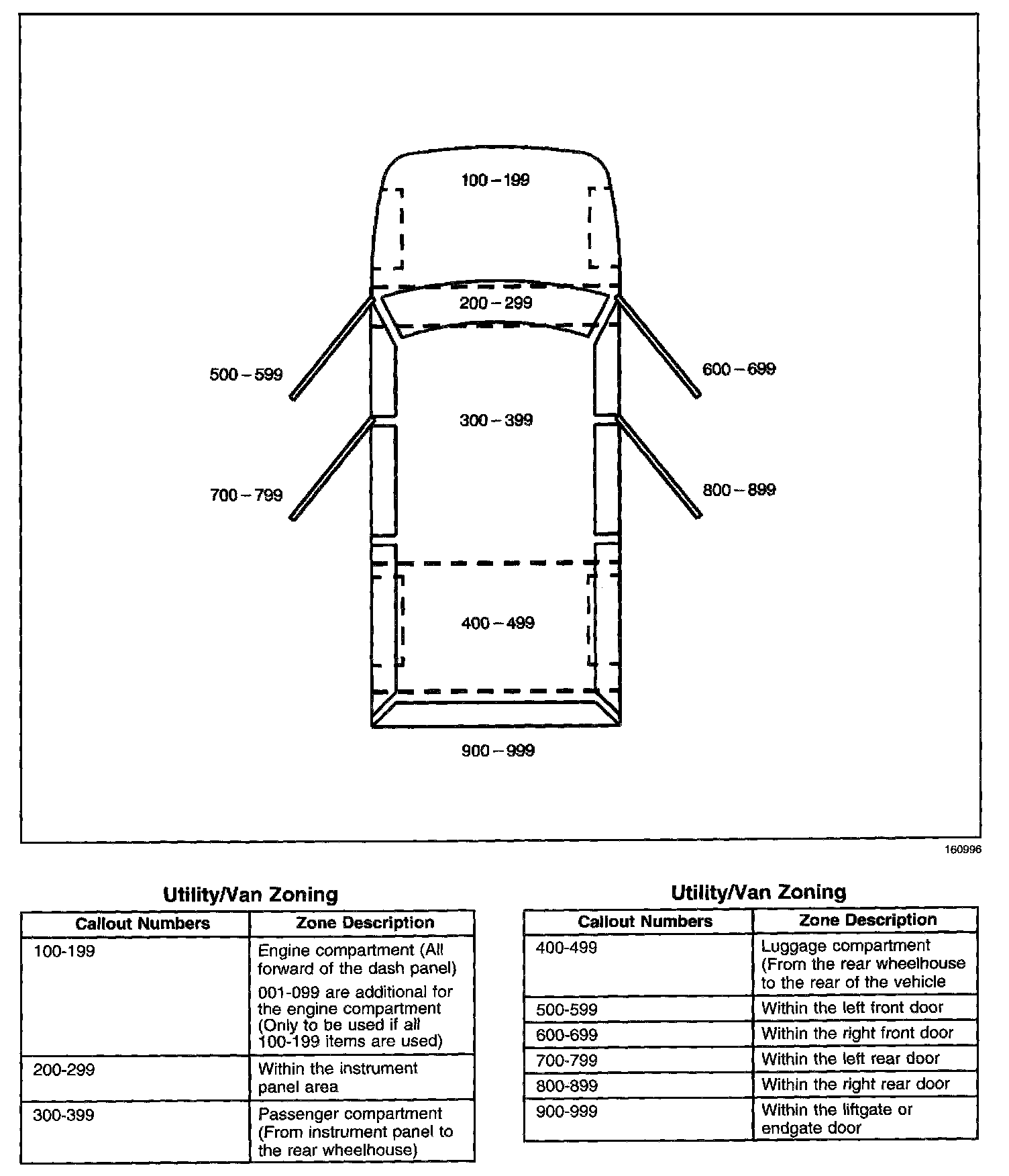 All grounds, in-line connectors, pass-through grommets, and splices have identifying numbers that correspond to where they are located in the vehicle. The following table explains the numbering system.