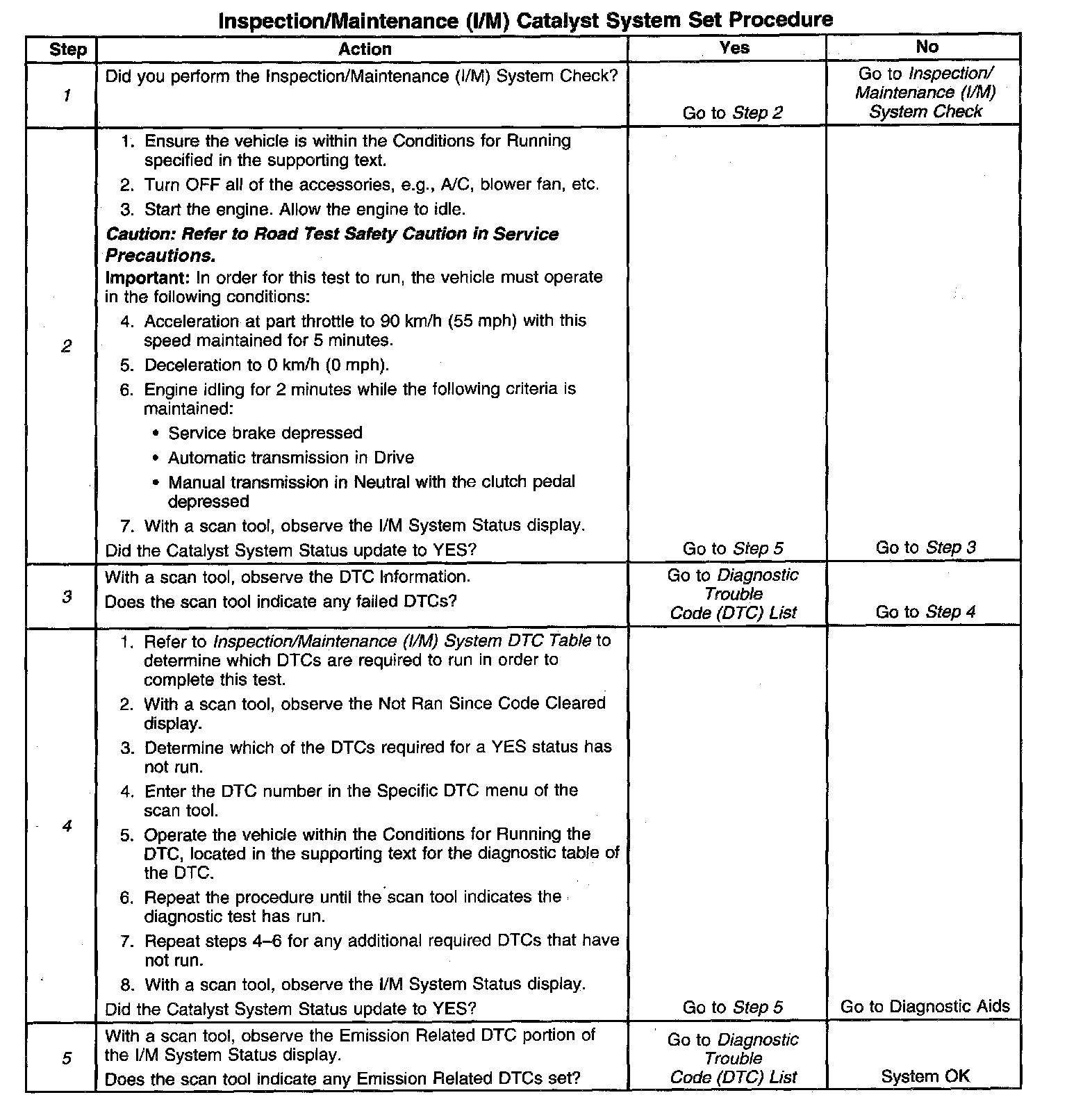 DESCRIPTIONThe purpose of this test is to satisfy the enable criteria necessary to execute I/M readiness diagnostics for the Catalyst System. The test may be used to set the I/M System Status indicators to YES. Ensure the vehicle meets the requirements listed in Conditions for Running before performing this test. Failure to meet the necessary requirements may produce inaccurate test results.