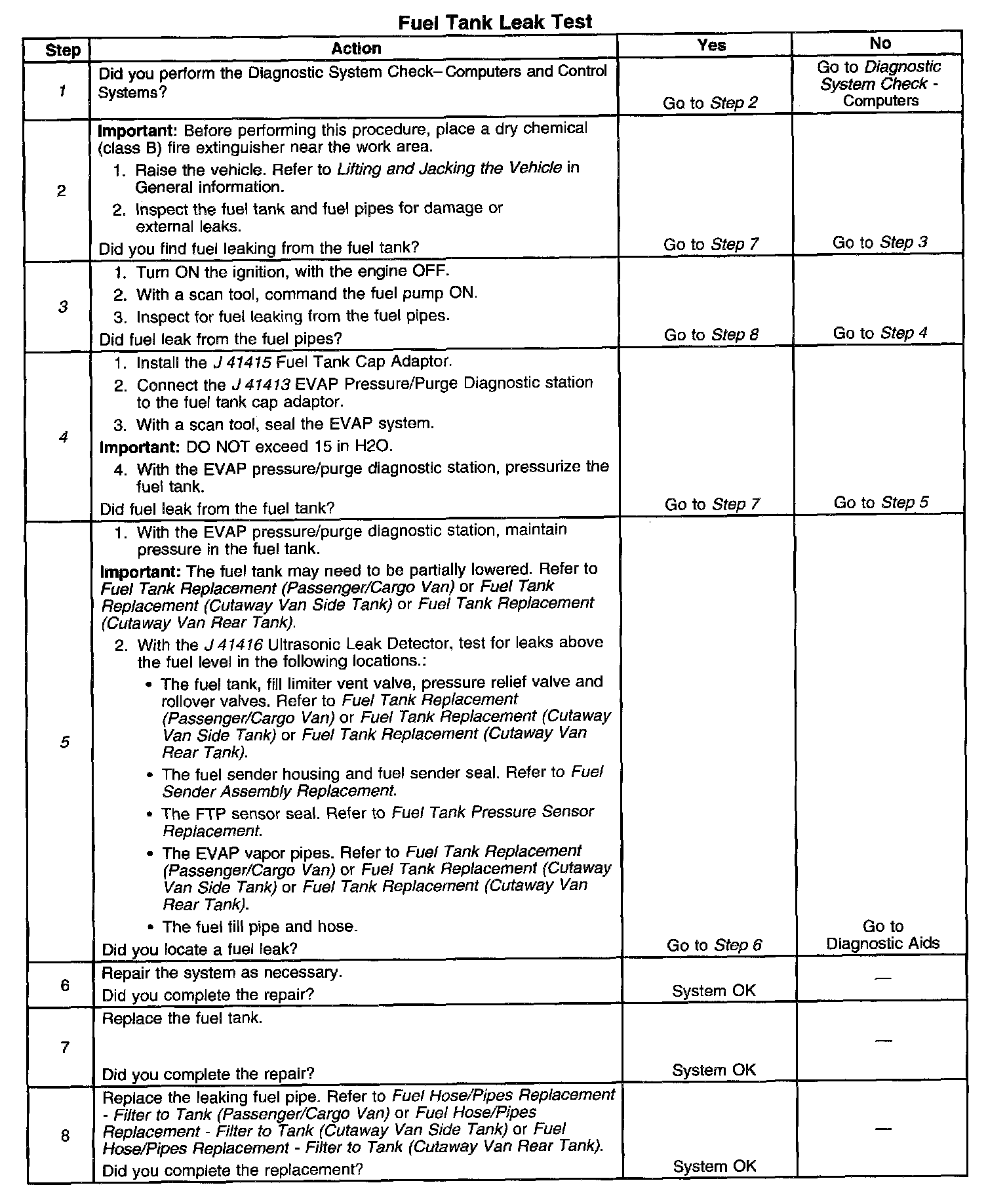 DESCRIPTIONThe fuel tank leak test is used to locate any fuel or fuel vapor escaping the fuel tank area. Fuel vapors escaping above the fuel level will be detected when the Evaporative Emission (EVAP) diagnostics completes one test cycle. The Malfunction Indicator Lamp (MIL) will illuminate after the EVAP diagnostics completes two test cycles.