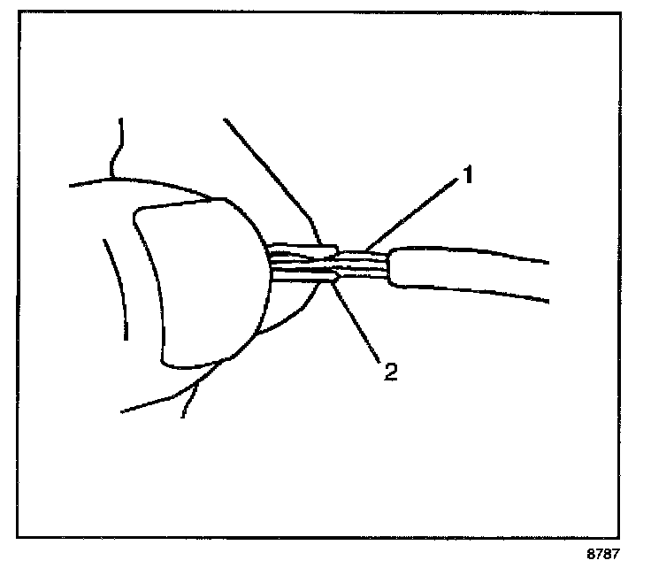 7. Center the splice clip (2) over the stripped wires (1) and hold the clip in place.